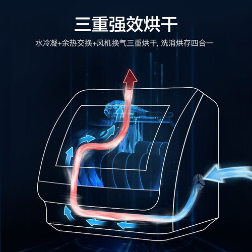 搭载FRA技术直驱变频电机,节能低噪在清洗餐具的同时,低调运行不打扰居家生活,内循环强劲风机加速空气流动,排出湿热空气。