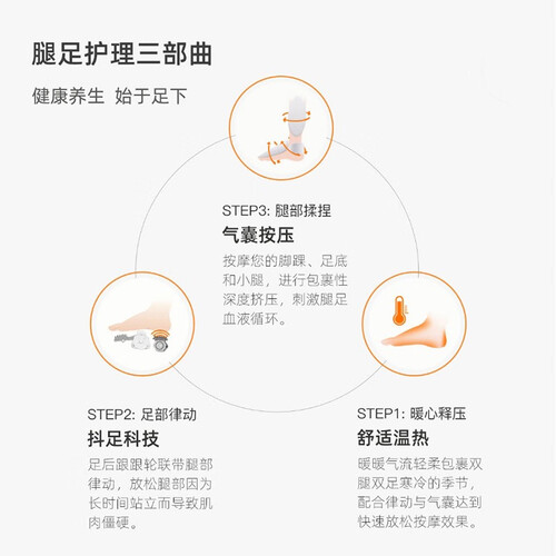 翻转式创意结构,健足又护腿,呵护老年人健康。气囊全包裹设计,张弛有度,深入刺激穴位,唤醒双脚活力。