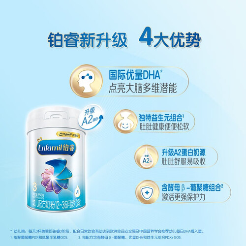 全新A2蛋白配方,亲和宝宝肠胃,减少宝宝哭闹的次数。营养丰富全面,满足大月龄宝宝成长所需,帮助骨骼发育。