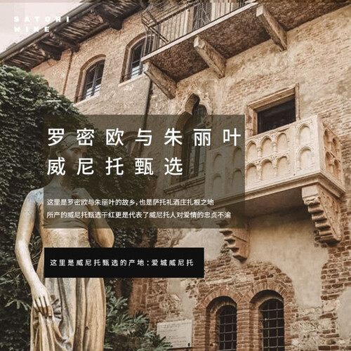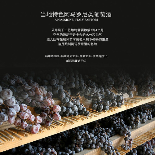 酒体轻盈,不添加改变原始风味的添加物,酸度绵长。采用枯藤酿造法,成就高级口感,用于意大利各地不同的菜肴,风味独特。