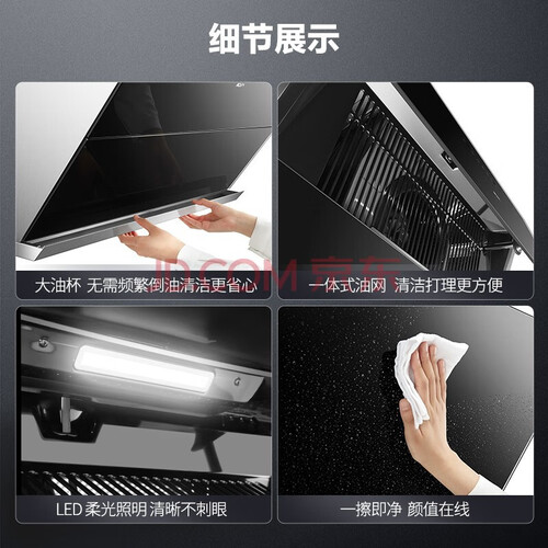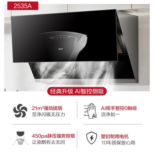 AI质感零触碰,挥手智控操作,告别误触,智享洁净厨房环境。至净闪吸,21m³大吸力,60秒快速换净空气,清新厨房环境。