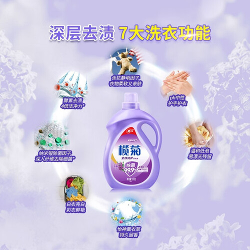 拥有抑菌除菌功效,能去除衣物上99%常见细菌,呵护肌肤健康。且表面活性剂成分,能深度瓦解顽渍,让衣物亮丽如新。