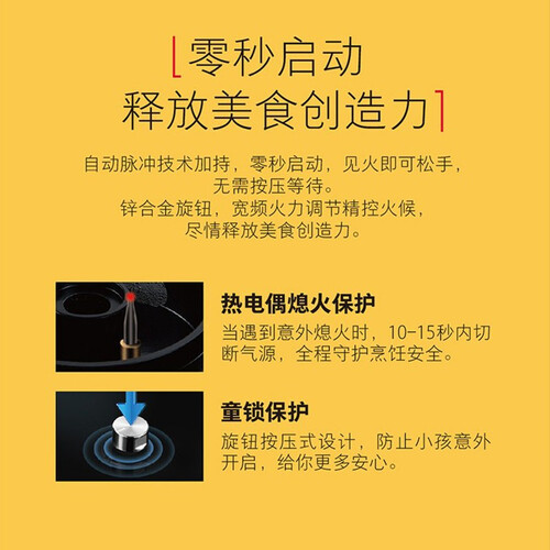 搭载热电偶熄火保护,在烹饪时如遇上意外会自动10-15秒内切断气源确保安全。旋转按压式童锁保护设计,防止小朋友意外开启。