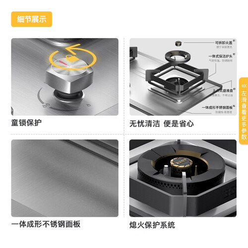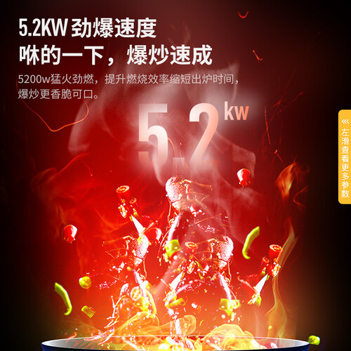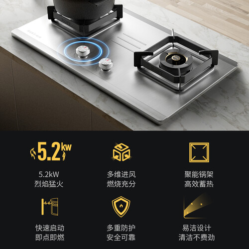 悬浮式炉头设计,利于氧气与燃气接触,帮助充分燃烧。火力达到了5.2KW,火候十足将锁定食物的鲜美。