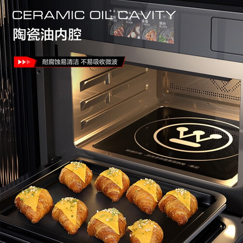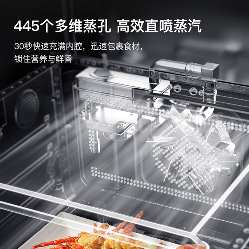 时尚科技感的全触摸高清液晶彩屏,炫彩画质直观大气。设置了445个多维蒸孔,高效蒸烤锁住新鲜营养。