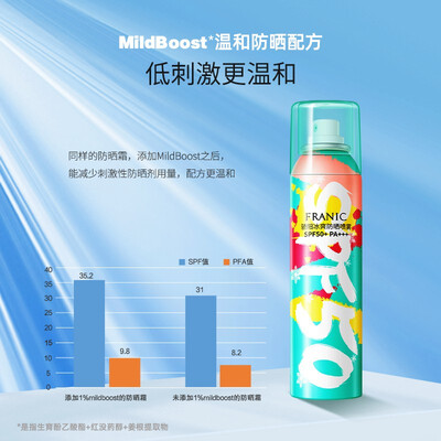 隐形水感速干型的防晒,日常简单喷涂不会影响妆容。温和的洋甘菊成分,舒缓镇定受损的肌肤,低刺激使用更安心。