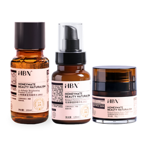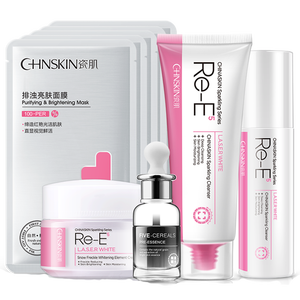 护肤套装中蕴含熊果苷、积雪草、七叶树等成分能够促进肌肤血液循环,避免血红素堆积,改善暗黄肌肤,打造焕白透亮肌肤。