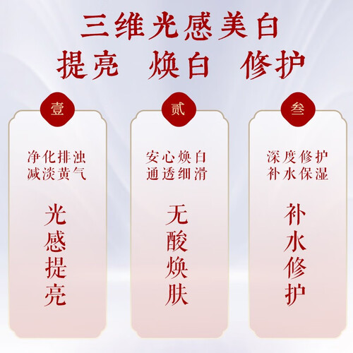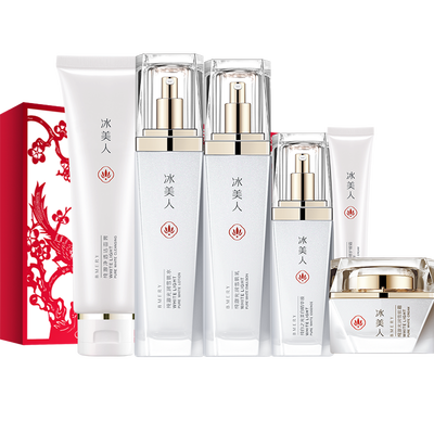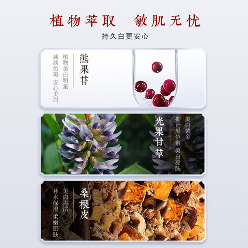护肤套装中蕴含熊果苷、光果甘草、桑根皮等成分,能抑制色素生成,淡化面部色斑,并能为肌肤补充水分,让肌肤水润有光泽。