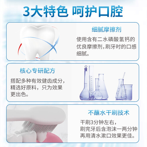 添加珍珠粉和细腻摩擦剂,深层净澈,清扫牙垢牙结石,改善牙齿黑黄问题,口感温和,还原牙齿光泽,不伤牙釉质。