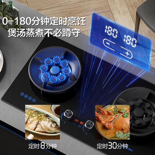 5.0KW猛火烈焰,九腔直喷,澎湃火力爆炒香,助你下厨快人一步。180分钟独立定时,双灶齐开不蹲守,到点即享美味菜肴。