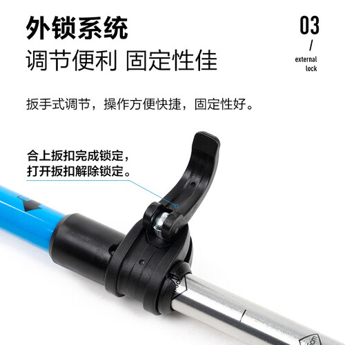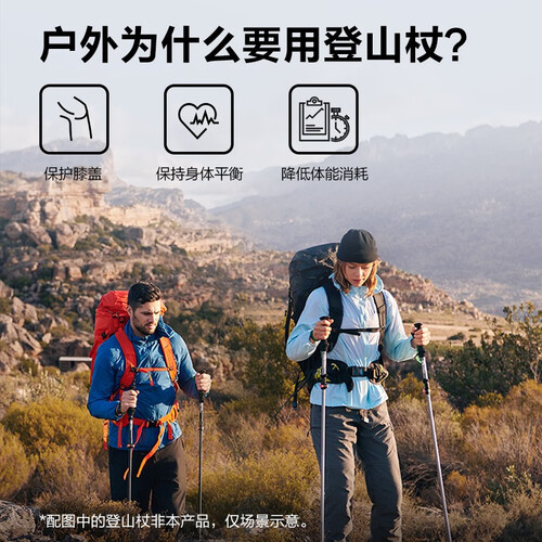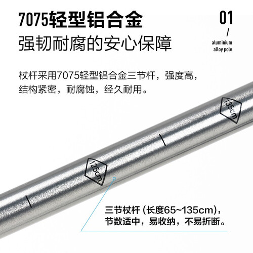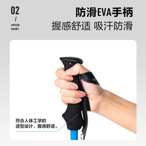 安全稳固的航空铝材质,登山时使用有助于保持身体平衡,轻松省力。舒适防滑的EVA手柄,良好的防汗效果,出汗时不易打滑。