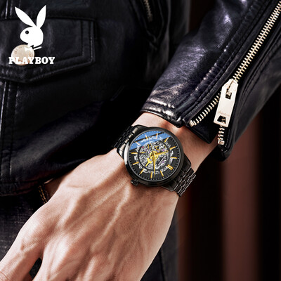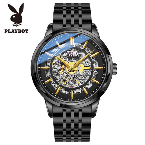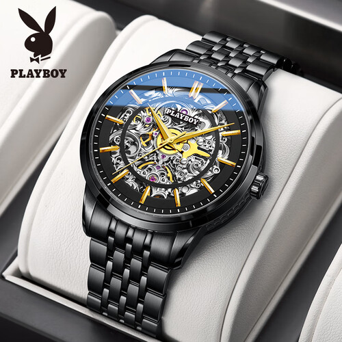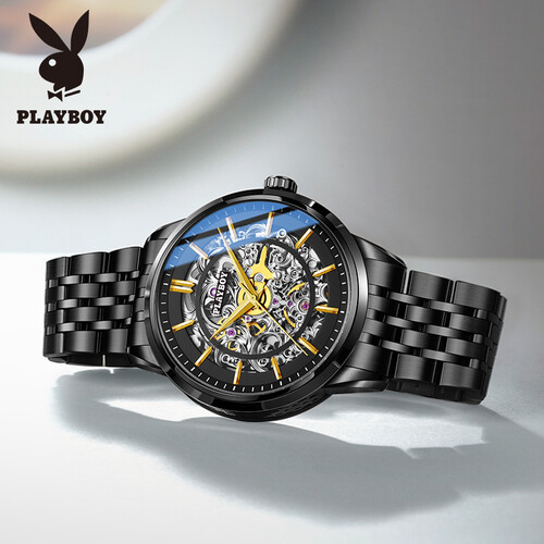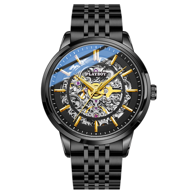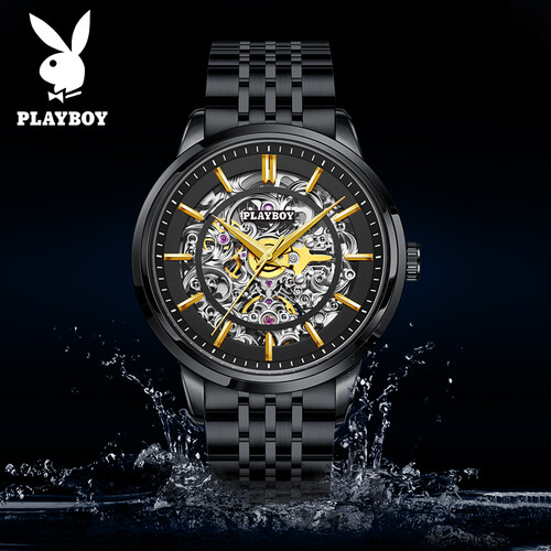 内置全自动机械机芯,精致的镂空雕花,让机械工艺一览无余。搭配全黑金钉钢带,大气有质感,佩戴更显时尚魅力。