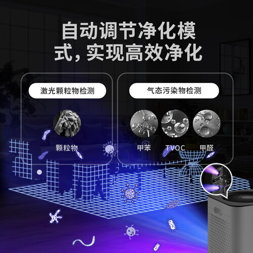 双涡轮旋风系统,能够双侧大面积进风,主动出击,净化快、准、狠,持续输出清新空气。采用紫晶催化技术,能够有效分解甲醛。