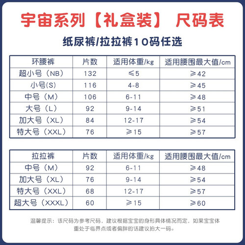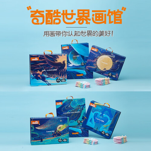 3D立体竖纹轨道,表面持久清爽。热风材质,包裹轻柔无感,敏感肌宝宝放心用,宇宙主题礼盒装,丰富图案带领宝宝一起探索世界。
