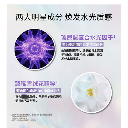 添加玻尿酸精华,可修护染后和漂后发丝的纤维,使秀发光滑顺亮。臻稀雪绒花精粹,呵护受损秀发,使秀发更加轻盈。