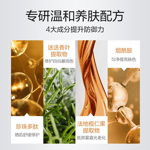 长达12.5小时防晒效果,有效抵御UVA/UVB对肌肤的伤害。添加珍珠多肽及烟酰胺养肤成分,焕亮肤色,防晒养肤二合一。