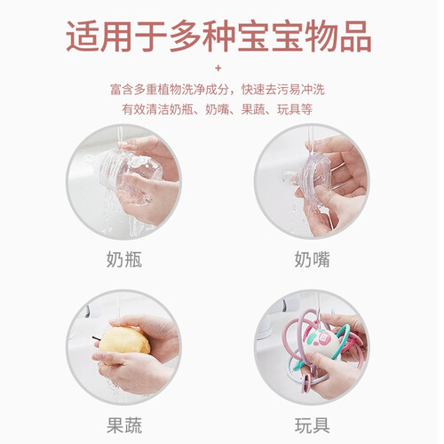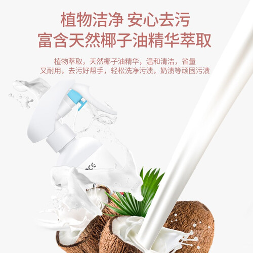 纯净温和配方,富含天然椰子油精华成分,轻松洗净多种顽固污渍。中性温和泡沫,用量省去污力强,无惧宝贝入口风险。