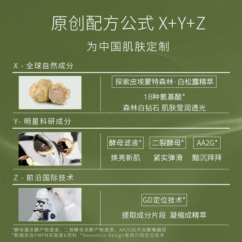 内含白松露精粹,蕴含18种氨基酸,可令肌肤变得莹润透亮。加入酵母滤液,以及二裂酵母成分,帮助焕亮肌肤,更加紧实弹滑。