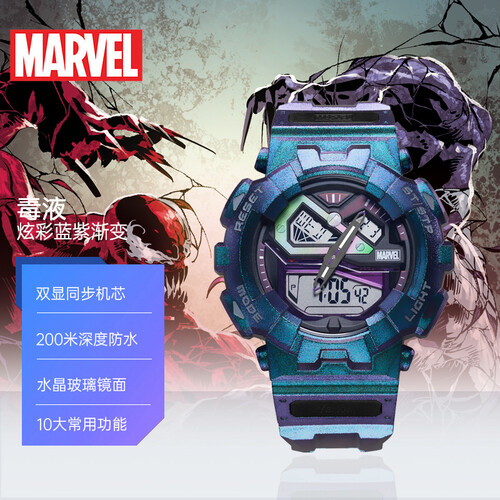 百迪漫威手表联名毒液手表,具有炫彩的配色设计,融入刚毅外壳,展现潮酷造型。升级防水配置,浮潜、冲浪、游泳佩戴皆相宜。