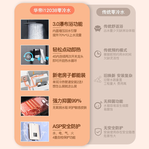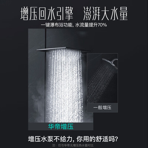 搭载增压回水引擎,一键开启瀑布浴,可提升70%以上水流量。强力增压水泵传输热水,多点供水瞬间直达,供水稳定。