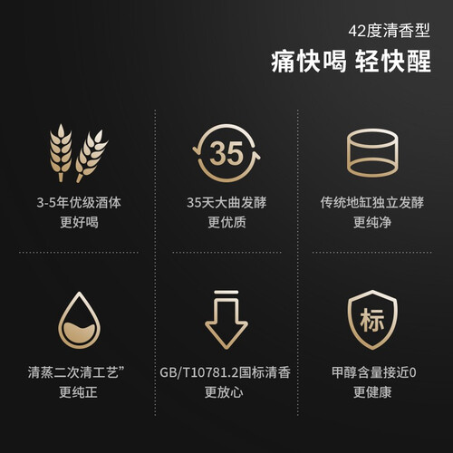 这款白酒采用纯粮固态发酵,口感平顺,酒体纯净,入口柔顺,快速醒酒。