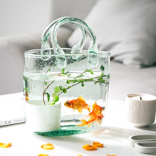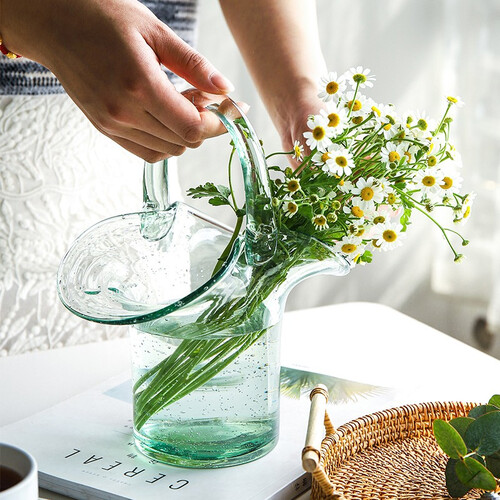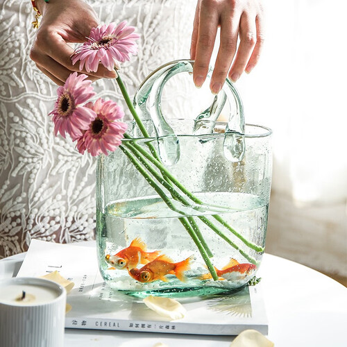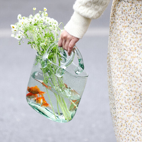 敞口弯曲提篮设计,优雅复古的造型,通透空灵的颜色,插什么花都好看。既可以当花瓶又可以当鱼缸,独特魅力。