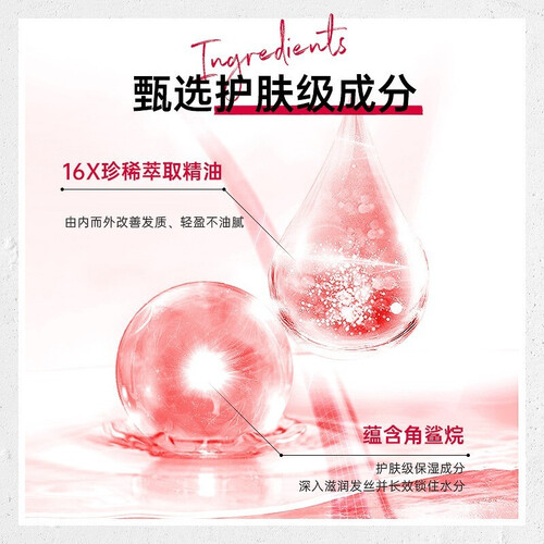 含有多种精萃,持久滋润粗糙发质,助力秀发打造水润质感。结合角鲨烷成分,提升秀发蓄水能力,牢锁水分不流失。