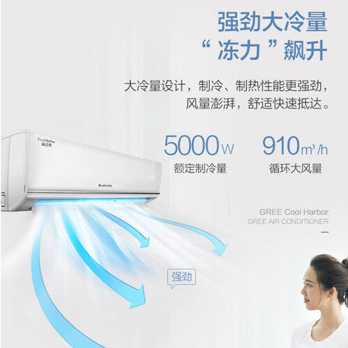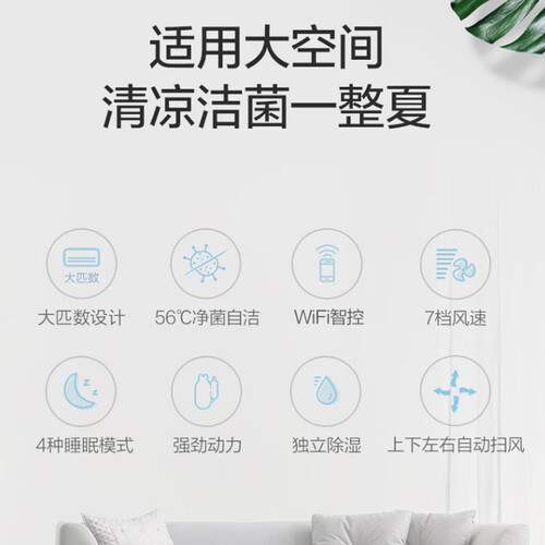 采用大冷量的技术设计,换热效率更高,风量更大。采用宽幅自动扫风的技术设计,全方位送风至全家各个角落,覆盖面更广。