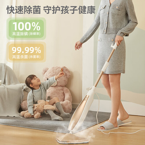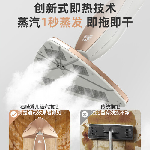 100%高温除菌,创新式即热技术,蒸汽1S蒸发,即拖即干。360°旋转拖头,LED清洁照明灯,大水箱不用频繁加水。