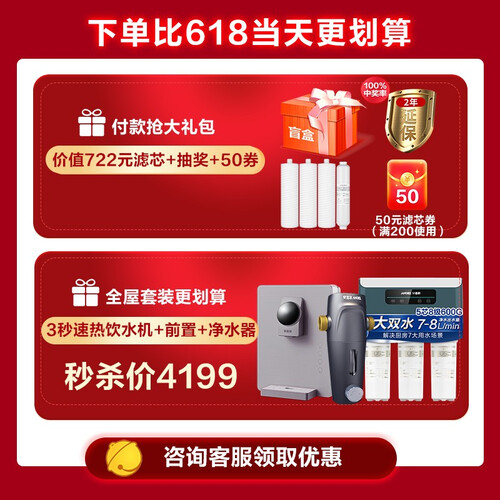 纯水、净水出水都很快,不必忍受涓涓细流,用水不久等。全线配置无铅水龙头,无二次污染,喝水更放心。