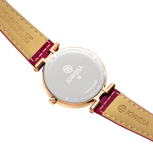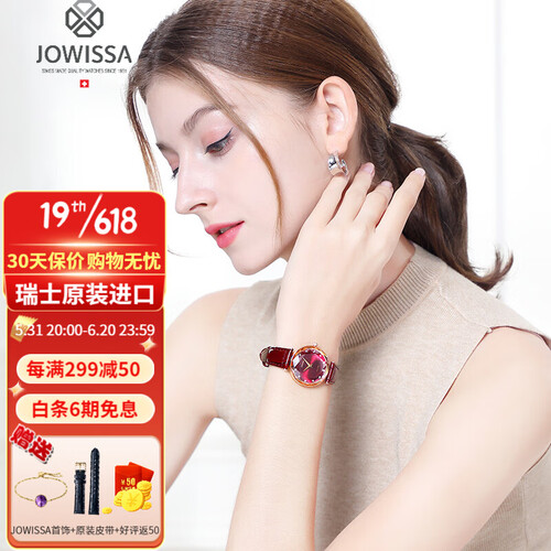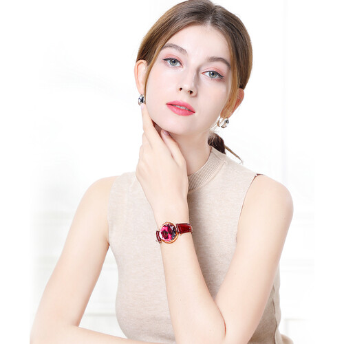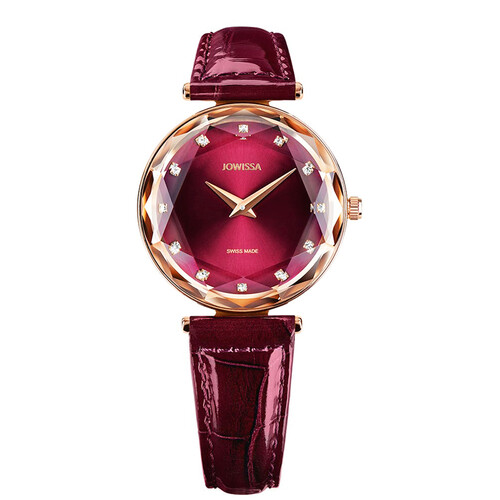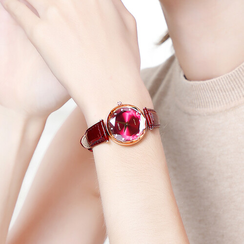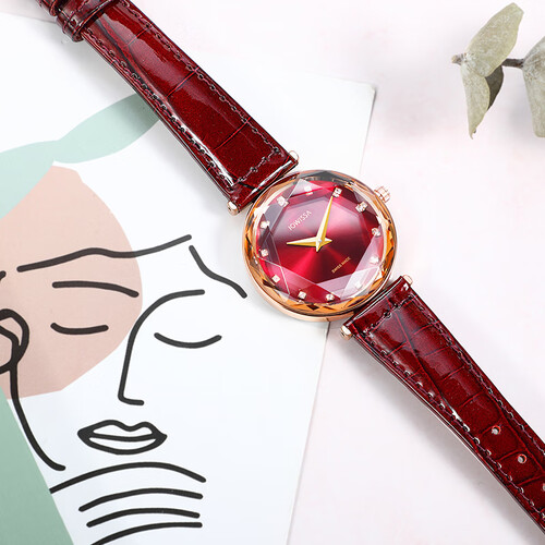菱形钻石样式表镜切割设计,造型层次丰富,呈现多面光泽,亮眼又吸睛。酒红色牛皮表带,质感出众,时尚雅致好搭。