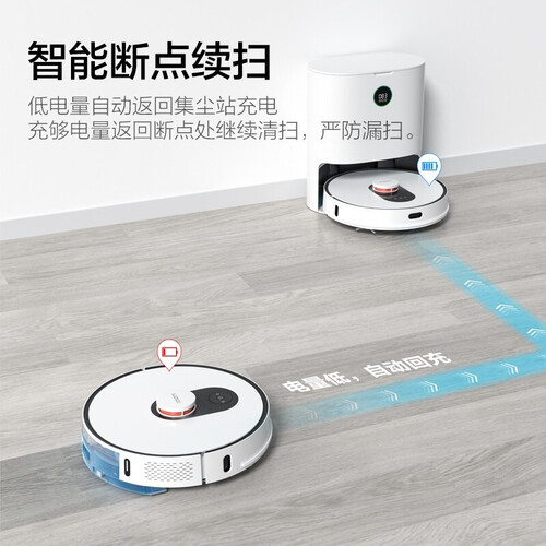 设有后吸集尘站,噪音较低,集尘效率较高,可将灰尘吸入自动打包。而且尘袋容量较大,出差旅行一个月不在家也不用担心过满。