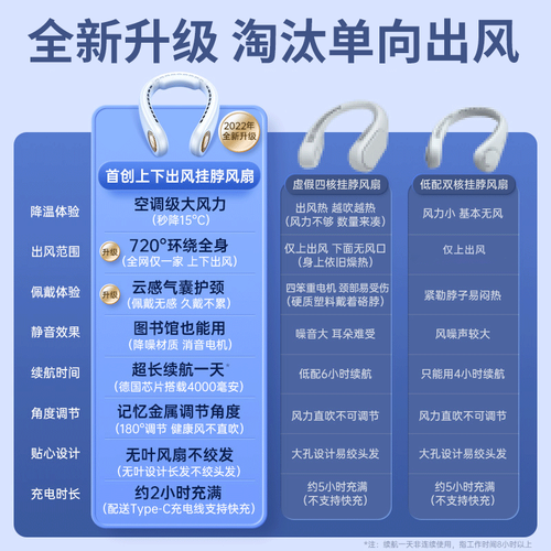 创新的双风道上下出风设计,让你的脖子、脸部和身体都能轻松感受清凉。角度可随意调节,不管胖子瘦子都能轻松使用。