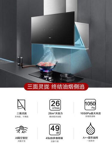 拥有950Pa大风压,油烟瞬吸无踪影,双灶爆炒依旧清新。采用多维降噪技术,52dB低分贝运行,夜间烹饪料理不打扰家人。