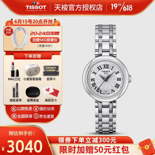 天梭银盘钢带石英防水女士腕表