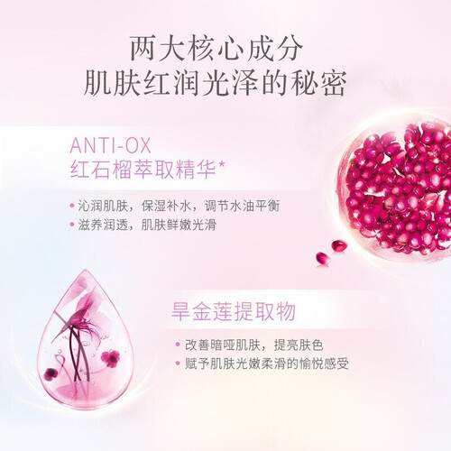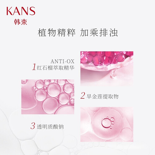 红石榴萃取精华、旱金莲提取物以及透明质酸钠等配比,深入沁润肌肤补水保湿,加乘肌肤排除污浊,调节水油平衡,改善黯哑无光。