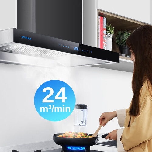 900mm巨幕屏,防止做饭时烟雾缭绕,快速净烟防止油烟乱窜。一键热炫自动洗功能,时刻保持烟机洁净,延长使用寿命。