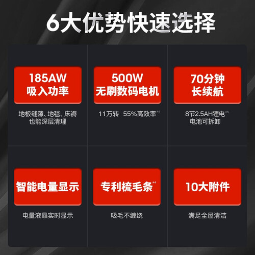 185AW大吸入功率,无论是毛发还是碎屑等杂物都能轻松吸除。低音降噪设计,持续保持轻音状态运行,静谧不扰眠。