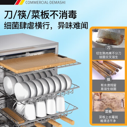 360°热风烘干循环,从多角度吹出热风,快速烘干餐具。配有不锈钢的层架,遇水后不易生锈,可长久使用。