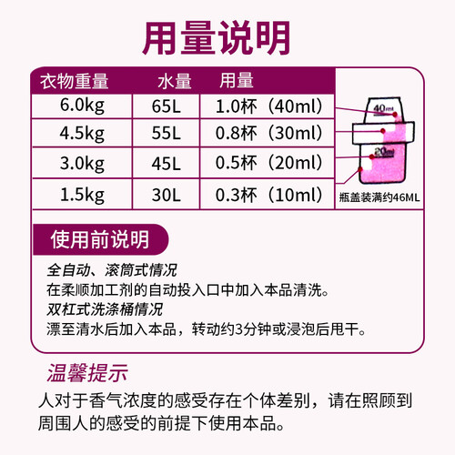 这款柔顺剂具有低粘速溶的特点,溶解速度快,漂洗后不会残留在衣物上。配方温和无刺激,可以护理贴身衣物,令其柔软舒适。