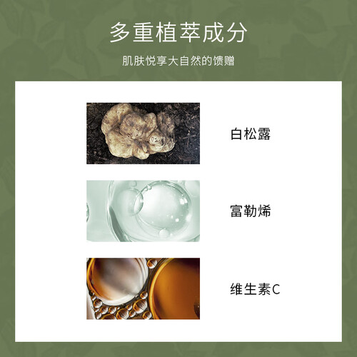 由法国白松露提取的蛋白质和氨基酸成分,给予肌肤充足的滋养,打造健康肌肤状态。搭配日本富勒烯成分,助力提升肌肤自身抵御力。
