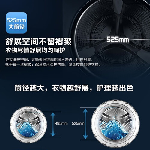 超声波空气洗,有助于抚平衣物褶皱,让衣物更平整。525mm大筒径,再次提升衣物摔打路径,出色完成除污任务。