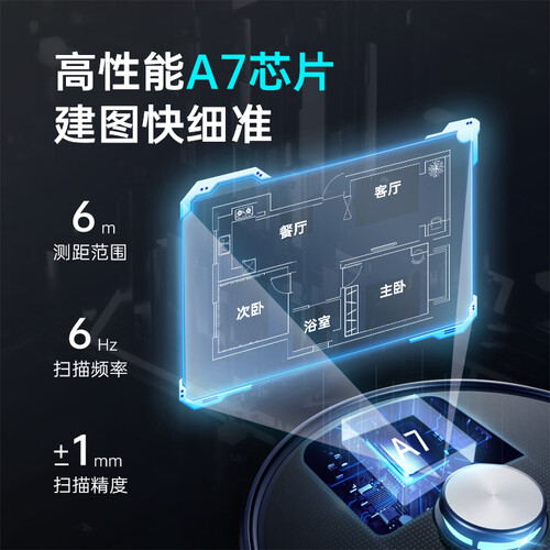 LDS激光导航智能规划,能够智能识别并规划清扫环境,提升清洁效率。360ml大容量水箱,渗水均匀,拖地不会留下水渍。