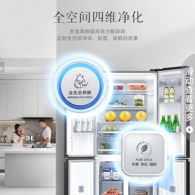 贵金属触媒,有效分解异味,实现全空间净化保鲜,打造洁净养鲜舱。搭载干湿可调抽屉,自由调湿,呵护食材原鲜。