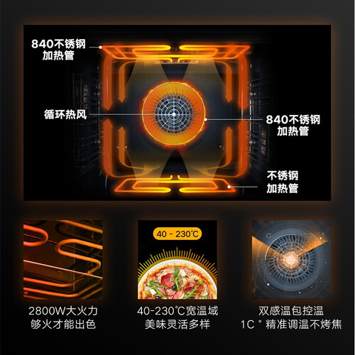 具有多功能的设定,满足烘烤蒸多样用途,提升了实用性能。配备840不锈钢加热管,使温度快速提升,40到230℃调节无忧。