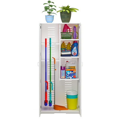 严选高密度PVC板材,厚实稳固,无惧日晒,防水性好。柜内分格设计,分类存放浴室用品,便于查找。