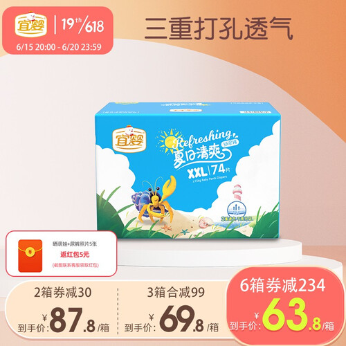 芯体仅达1.3mm,与相同的拉拉裤相比更减薄35%,宝宝穿戴无负担。采用三重打孔设计,使用更干爽。