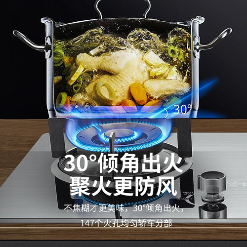 30°倾角除出火设计,有效防止食材焦糊,均匀升温快速加热。搭配X型支锅架,自由翻炒无后顾之忧,安全烹饪防侧翻。