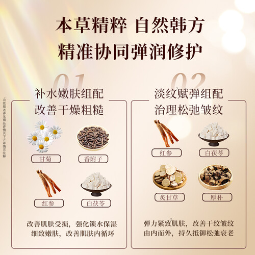 甄选高丽红参精粹与多种珍贵草本成分,带来丰富修护能量,达到稳定淡纹效果。同时深入肌底,由内而外收紧肌肤,告别松弛垮脸。
