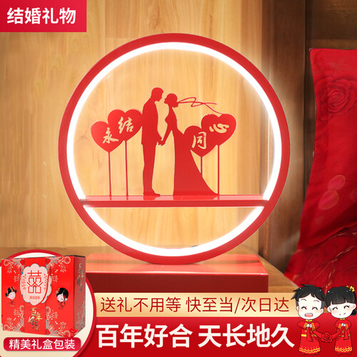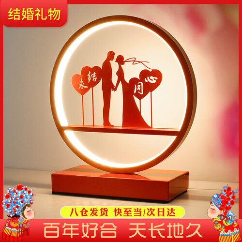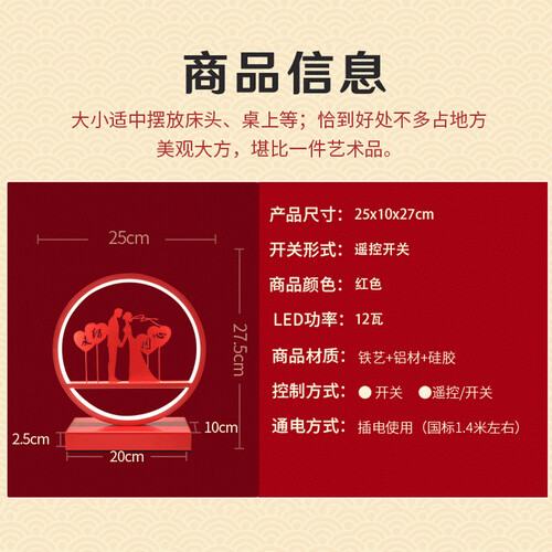 明艳红框、充满爱意的情侣图案,勾勒出新人之间的无限美好,是婚房的点睛装饰。点起一盏灯,祝福美满生活。